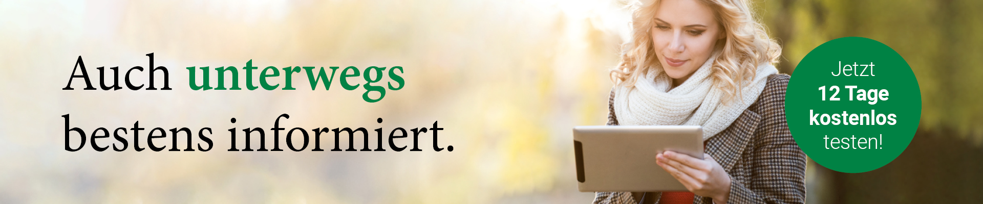 Nutzen Sie den kostenlosen 12-Tage-Gratis-Test um die Heimatzeitung als digitale Ausgabe kennenzulernen. Lesen Sie das E-Paper (alle regionalen Ausgaben) und alle Premium-Artikel iS+ 12 Tage lang kostenlos – das Abo endet automatisch.